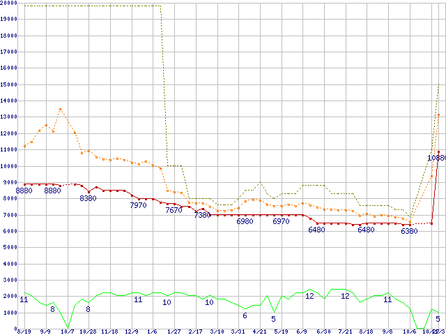 WD10TPVT (1TB,8MB,12.5mm厚)の価格推移↑前グラフ↓次グラフ(2010年8月19日〜2011年11月3日)※このグラフは過去のデータも税率5%相当に調整した税込み相当額のグラフです。●関連グラフHDD/SSD主要製品の最安値推移HDD/SSD主要製品(最安値1万円〜1万5千円未満)の最安値推移HDD 1TB〜1.5TB未満の最安値推移WD Scorpio Blue (5200〜5400rpm,3Gb/s,2.5インチ)の最安値推移●凡例最安値(点線部は販売店未確認または未調査)平均値最高値ショップ数