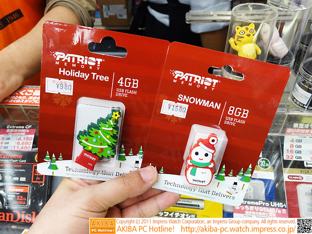 ![]() | AKIBA PC Hotline! 今週見つけた新製品:フラッシュメモリカード/USBメモリ [拡大画像]PATRIOT SNOWMAN(PSF8GUSBXMASSM) PATRIOT Holiday Tree(PSF4GUSBXMASTR) |