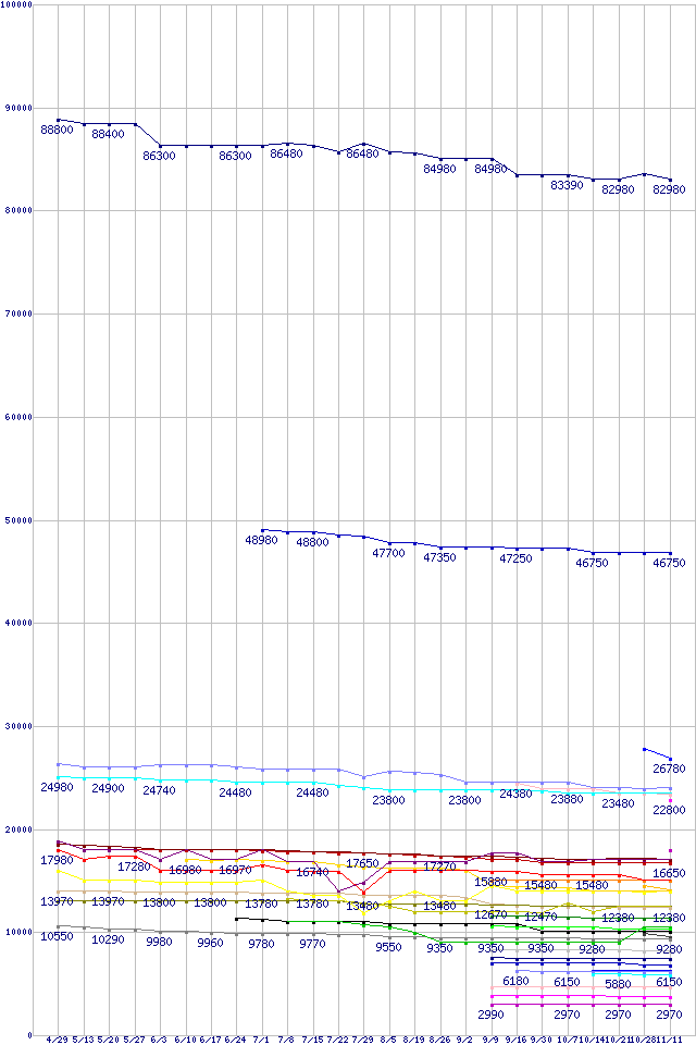 CPU主要製品の最安値推移↑前グラフ↓次グラフ(2011年4月29日〜2011年11月11日)※このグラフは過去のデータも税率5%相当に調整した税込み相当額のグラフです。凡例Core i7-990X Extreme Edition (3.46GHz)Core i7-980 (3.33GHz)Core i7-2700K (3.50GHz)Core i7-2600K (3.40GHz)Core i7-2600 (3.40GHz)Core i7-2600S (2.80GHz)FX-8150 (3.6GHz,L2 8MB,L3 8MB,TDP 125W)FX-8120 (3.1GHz,L2 8MB,L3 8MB,TDP 125W)Phenom II X6 1100T Black Edition (3.3GHz,L2 512KB×6,L3 6MB,TDP 125W)Core i5-2500K (3.30GHz,TDP 95W)Core i5-2405S (2.50GHz,TDP 65W)Phenom II X6 1090T Black Edition (3.2GHz,L2 512KB×6,L3 6MB,TDP 125W)Core i5-2320 (3.00GHz,TDP 95W)FX-6100 (3.3GHz,L2 6MB,L3 8MB,TDP 95W)Phenom II X4 980 Black Edition (3.7GHz,L2 512KB×4,L3 6MB,TDP 125W)Phenom II X6 1065T (2.9GHz,L2 512KB×6,L3 6MB,TDP 95W)A8-3850 (2.9GHz,TDP 100W)Phenom II X4 910e (2.6GHz,L2 512KB×4,L3 6MB,TDP 65W)Phenom II X4 970 Black Edition (3.5GHz,L2 512KB×4,L3 6MB,TDP 125W)Core i3-2125 (3.30GHz,TDP 65W)A6-3650 (2.6GHz,TDP 100W)Core i3-2120T (2.60GHz,TDP 35W)Phenom II X4 960T Black Edition (3.0GHz,L2 512KB×4,L3 6MB,TDP 95W)FX-4100 (3.6GHz,L2 4MB,L3 8MB,TDP 95W)Core i3-2100 (3.1GHz,TDP 65W)A6-3500 (2.1GHz,TDP 65W)Pentium G860 (3.0GHz,TDP 65W)Athlon II X4 631 (2.6GHz,TDP 100W)A4-3400 (2.7GHz,TDP 65W)Pentium G630T (2.3GHz,TDP 35W)A4-3300 (2.5GHz,TDP 65W)Celeron G540 (2.5GHz,2MB,TDP 65W)Celeron G530 (2.4GHz,2MB,TDP 65W)Celeron G440 (1.6GHz,1MB,シングルコア,TDP 35W)※製品名をクリックすると個別のグラフを表示します※点線部は販売店が確認できなかった、または調査データがないことを示します