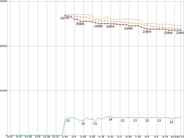 Core i7-2600 (3.40GHz)の価格推移↑前グラフ↓次グラフ(2010年8月27日〜2011年11月11日)※このグラフは過去のデータも税率5%相当に調整した税込み相当額のグラフです。●関連グラフCPU主要製品の最安値推移CPU主要製品(最安値2万円〜3万円未満)の最安値推移Intel系CPUの最安値推移LGA1155 (Smart Cache 8MB,Quad Core,GPU内蔵,Hyper-Threading,TDP 95W)の最安値推移●凡例最安値(点線部は販売店未確認または未調査)平均値最高値ショップ数