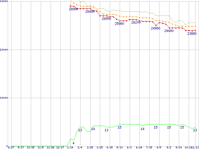 Core i7-2600K (3.40GHz)の価格推移↑前グラフ↓次グラフ(2010年8月27日〜2011年11月11日)※このグラフは過去のデータも税率5%相当に調整した税込み相当額のグラフです。●関連グラフCPU主要製品の最安値推移CPU主要製品(最安値2万円〜3万円未満)の最安値推移Intel系CPUの最安値推移LGA1155 (Smart Cache 8MB,Quad Core,GPU内蔵,Hyper-Threading,TDP 95W)の最安値推移●凡例最安値(点線部は販売店未確認または未調査)平均値最高値ショップ数