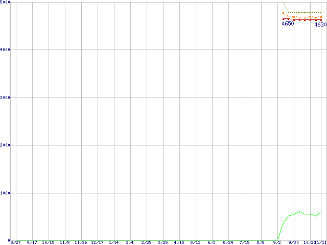 Celeron G540 (2.5GHz,2MB,TDP 65W)の価格推移↑前グラフ↓次グラフ(2010年8月27日〜2011年11月11日)※このグラフは過去のデータも税率5%相当に調整した税込み相当額のグラフです。●関連グラフCPU主要製品の最安値推移CPU主要製品(最安値1万円未満)の最安値推移Intel系CPUの最安値推移LGA1155 (GPU内蔵)の最安値推移●凡例最安値(点線部は販売店未確認または未調査)平均値最高値ショップ数