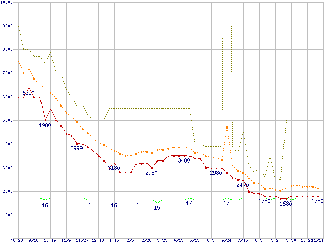 PC3-10600 2GB×2枚組みセットの価格推移↑前グラフ↓次グラフ(2010年8月28日〜2011年11月11日)※このグラフは過去のデータも税率5%相当に調整した税込み相当額のグラフです。●関連グラフメモリ主要製品の最安値推移4GBモジュール/2GBモジュール×2枚の最安値推移メモリ主要製品(最安値5千円未満)の最安値推移PC3-10600(DDR3-1333) DDR3 SDRAM DIMMの最安値推移●凡例最安値(点線部は販売店未確認または未調査)平均値最高値ショップ数