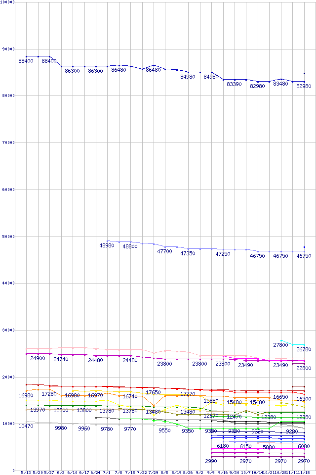 CPU主要製品の最安値推移↑前グラフ↓次グラフ(2011年5月13日〜2011年11月18日)※このグラフは過去のデータも税率5%相当に調整した税込み相当額のグラフです。凡例Core i7-3960X Extreme Edition (3.30GHz,15MB)Core i7-990X Extreme Edition (3.46GHz)Core i7-3930K (3.20GHz,12MB)Core i7-980 (3.33GHz)Core i7-2700K (3.50GHz)Core i7-2600K (3.40GHz)Core i7-2600S (2.80GHz)Core i7-2600 (3.40GHz)FX-8150 (3.6GHz,L2 8MB,L3 8MB,TDP 125W)FX-8120 (3.1GHz,L2 8MB,L3 8MB,TDP 125W)Core i5-2500K (3.30GHz,TDP 95W)Core i5-2405S (2.50GHz,TDP 65W)Phenom II X6 1090T Black Edition (3.2GHz,L2 512KB×6,L3 6MB,TDP 125W)Core i5-2320 (3.00GHz,TDP 95W)Phenom II X4 980 Black Edition (3.7GHz,L2 512KB×4,L3 6MB,TDP 125W)Phenom II X6 1065T (2.9GHz,L2 512KB×6,L3 6MB,TDP 95W)FX-6100 (3.3GHz,L2 6MB,L3 8MB,TDP 95W)A8-3850 (2.9GHz,TDP 100W)Phenom II X4 910e (2.6GHz,L2 512KB×4,L3 6MB,TDP 65W)Phenom II X4 970 Black Edition (3.5GHz,L2 512KB×4,L3 6MB,TDP 125W)Core i3-2125 (3.30GHz,TDP 65W)A6-3650 (2.6GHz,TDP 100W)Core i3-2120T (2.60GHz,TDP 35W)Phenom II X4 960T Black Edition (3.0GHz,L2 512KB×4,L3 6MB,TDP 95W)FX-4100 (3.6GHz,L2 4MB,L3 8MB,TDP 95W)Core i3-2100 (3.1GHz,TDP 65W)A6-3500 (2.1GHz,TDP 65W)Pentium G860 (3.0GHz,TDP 65W)Athlon II X4 631 (2.6GHz,TDP 100W)Pentium G630T (2.3GHz,TDP 35W)A4-3400 (2.7GHz,TDP 65W)A4-3300 (2.5GHz,TDP 65W)Celeron G540 (2.5GHz,2MB,TDP 65W)Celeron G530 (2.4GHz,2MB,TDP 65W)Celeron G440 (1.6GHz,1MB,シングルコア,TDP 35W)※製品名をクリックすると個別のグラフを表示します※点線部は販売店が確認できなかった、または調査データがないことを示します