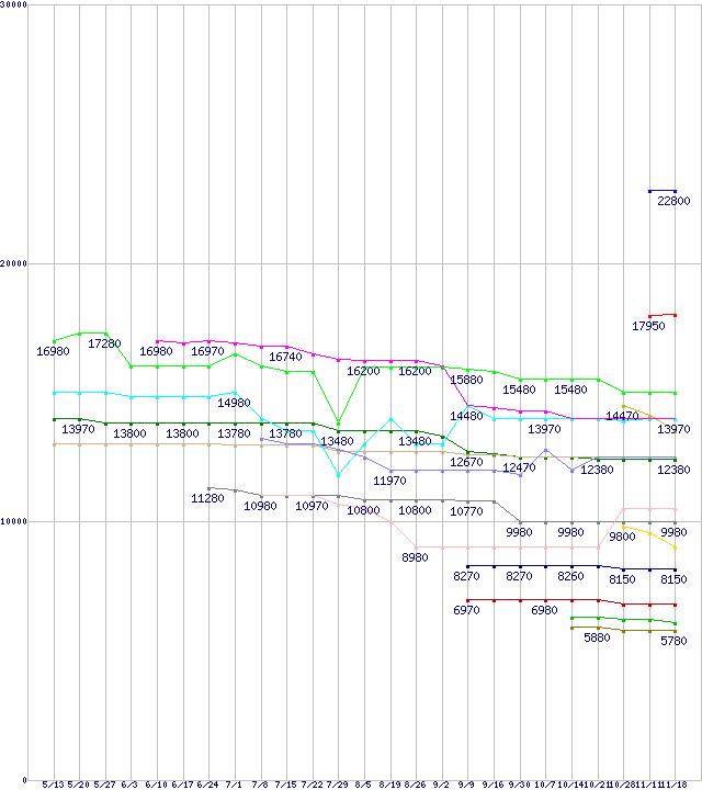 AMD系CPUの最安値推移↑前グラフ↓次グラフ(2011年5月13日〜2011年11月18日)※このグラフは過去のデータも税率5%相当に調整した税込み相当額のグラフです。凡例FX-8150 (3.6GHz,L2 8MB,L3 8MB,TDP 125W)FX-8120 (3.1GHz,L2 8MB,L3 8MB,TDP 125W)Phenom II X6 1090T Black Edition (3.2GHz,L2 512KB×6,L3 6MB,TDP 125W)Phenom II X4 980 Black Edition (3.7GHz,L2 512KB×4,L3 6MB,TDP 125W)Phenom II X6 1065T (2.9GHz,L2 512KB×6,L3 6MB,TDP 95W)FX-6100 (3.3GHz,L2 6MB,L3 8MB,TDP 95W)A8-3850 (2.9GHz,TDP 100W)Phenom II X4 910e (2.6GHz,L2 512KB×4,L3 6MB,TDP 65W)Phenom II X4 970 Black Edition (3.5GHz,L2 512KB×4,L3 6MB,TDP 125W)A6-3650 (2.6GHz,TDP 100W)Phenom II X4 960T Black Edition (3.0GHz,L2 512KB×4,L3 6MB,TDP 95W)FX-4100 (3.6GHz,L2 4MB,L3 8MB,TDP 95W)A6-3500 (2.1GHz,TDP 65W)Athlon II X4 631 (2.6GHz,TDP 100W)A4-3400 (2.7GHz,TDP 65W)A4-3300 (2.5GHz,TDP 65W)※製品名をクリックすると個別のグラフを表示します※点線部は販売店が確認できなかった、または調査データがないことを示します