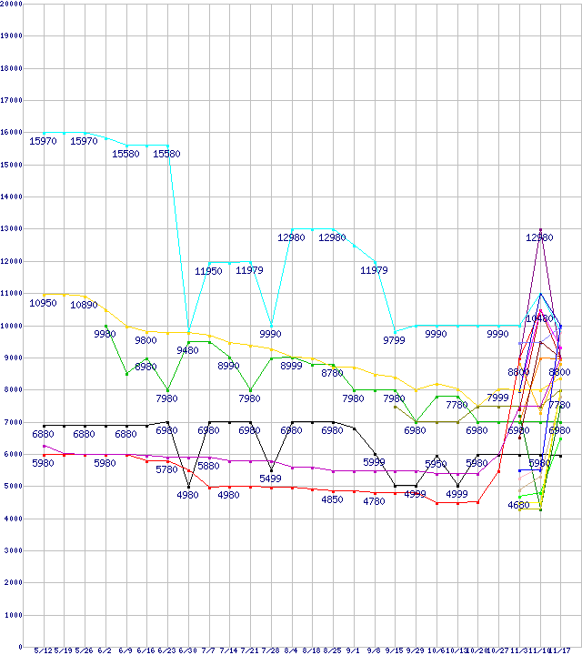 HDD/SSD主要製品(最安値1万円未満)の最安値推移↑前グラフ↓次グラフ(2011年5月12日〜2011年11月17日)※このグラフは過去のデータも税率5%相当に調整した税込み相当額のグラフです。凡例WesternDigital製その他2.5インチHDD 750GBHN-M750MBB (750GB,8MB)MK7559GSXP (750GB,8MB)SAMSUNG製その他3.5インチHDD 1TBその他2.5インチSSD (128GB,MLC)日立製その他2.5インチHDD 750GBST9750420AS (750GB,16MB)0S03085 (750GB,8MB)WesternDigital製その他3.5インチHDD 1TB日立製その他3.5インチHDD 500GBST9750423AS (750GB,16MB)WD7500BPVT (750GB,8MB)Seagate製その他3.5インチHDD 500GBSAMSUN製その他2.5インチHDD 500GBCT064M4SSD2 (64GB,MLC)WesternDigital製その他2.5インチHDD 500GB東芝製その他2.5インチHDD 500GBその他SandForce製コントローラ搭載SSD(6Gbps) (60GB,MLC)Seagate製その他2.5インチHDD 500GBWesternDigital製その他3.5インチHDD 500GBその他6Gbps対応SSD (64GB,MLC)日立製その他2.5インチHDD 500GBその他2.5インチSSD (64GB,MLC)※製品名をクリックすると個別のグラフを表示します※点線部は販売店が確認できなかった、または調査データがないことを示します