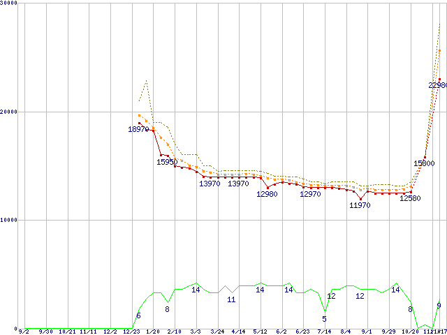 0S03088(純正パッケージ品) (3TB,64MB)の価格推移↑前グラフ↓次グラフ(2010年9月2日〜2011年11月17日)※このグラフは過去のデータも税率5%相当に調整した税込み相当額のグラフです。●関連グラフHDD/SSD主要製品の最安値推移HDD/SSD主要製品(最安値2万円以上)の最安値推移HDD 3TB以上の最安値推移DESKSTAR (6Gb/s)の最安値推移●凡例最安値(点線部は販売店未確認または未調査)平均値最高値ショップ数
