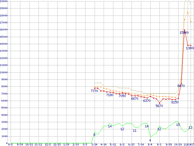0S03224(純正パッケージ品) (2TB,32MB)の価格推移↑前グラフ↓次グラフ(2010年9月2日〜2011年11月17日)※このグラフは過去のデータも税率5%相当に調整した税込み相当額のグラフです。●関連グラフHDD/SSD主要製品の最安値推移HDD/SSD主要製品(最安値1万円〜1万5千円未満)の最安値推移HDD 2TB〜2.5TB未満の最安値推移DESKSTAR (6Gb/s)の最安値推移2TB HDDの最安値推移●凡例最安値(点線部は販売店未確認または未調査)平均値最高値ショップ数