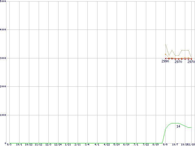 Celeron G440 (1.6GHz,1MB,シングルコア,TDP 35W)の価格推移↑前グラフ↓次グラフ(2010年9月3日〜2011年11月18日)※このグラフは過去のデータも税率5%相当に調整した税込み相当額のグラフです。●関連グラフCPU主要製品の最安値推移CPU主要製品(最安値1万円未満)の最安値推移Intel系CPUの最安値推移LGA1155 (GPU内蔵)の最安値推移●凡例最安値(点線部は販売店未確認または未調査)平均値最高値ショップ数