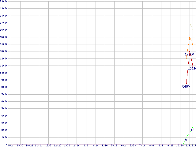 Seagate製その他3.5インチHDD 1TBの価格推移↑前グラフ↓次グラフ(2010年9月2日〜2011年11月17日)※このグラフは過去のデータも税率5%相当に調整した税込み相当額のグラフです。●関連グラフHDD/SSD主要製品の最安値推移HDD/SSD主要製品(最安値1万円〜1万5千円未満)の最安値推移HDD 1TB〜1.5TB未満の最安値推移Seagate製その他3.5インチHDD (SATA)の最安値推移●凡例最安値(点線部は販売店未確認または未調査)平均値最高値ショップ数