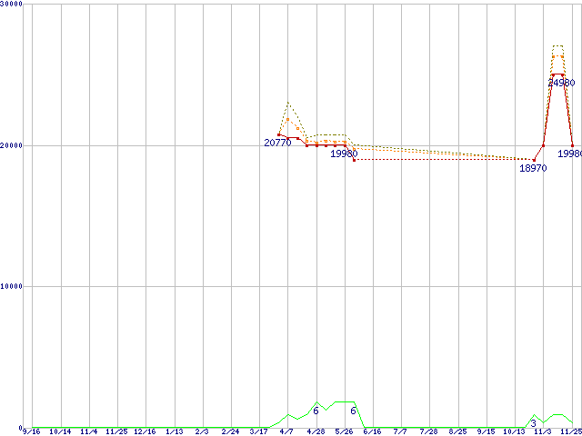 ST33000651AS (3TB,64MB)の価格推移↑前グラフ↓次グラフ(2010年9月16日〜2011年11月25日)※このグラフは過去のデータも税率5%相当に調整した税込み相当額のグラフです。●関連グラフHDD/SSD主要製品の最安値推移HDD/SSD主要製品(最安値1万5千円〜2万円未満)の最安値推移HDD 3TB以上の最安値推移Barracuda XT (7200rpm,6Gbps)の最安値推移●凡例最安値(点線部は販売店未確認または未調査)平均値最高値ショップ数