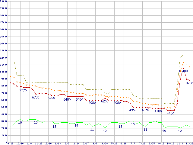 WD7500BPVT (750GB,8MB)の価格推移↑前グラフ↓次グラフ(2010年9月16日〜2011年11月25日)※このグラフは過去のデータも税率5%相当に調整した税込み相当額のグラフです。●関連グラフHDD/SSD主要製品の最安値推移HDD/SSD主要製品(最安値1万円未満)の最安値推移HDD 750GB〜1TB未満の最安値推移WD Scorpio Blue (5200〜5400rpm,3Gb/s,2.5インチ)の最安値推移●凡例最安値(点線部は販売店未確認または未調査)平均値最高値ショップ数