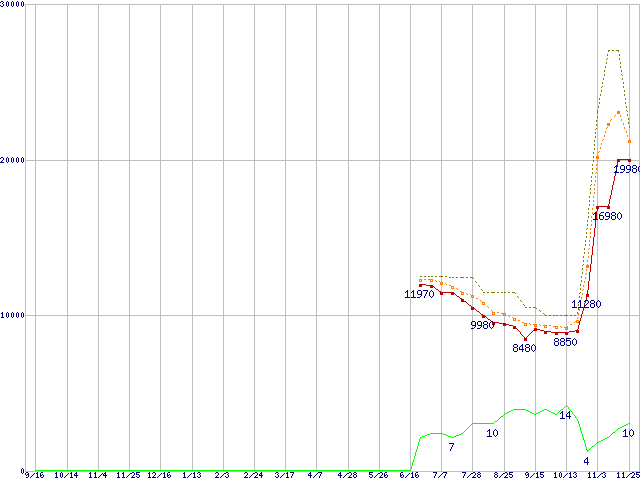 0S03229(純正パッケージ品) (3TB,32MB)の価格推移↑前グラフ↓次グラフ(2010年9月16日〜2011年11月25日)※このグラフは過去のデータも税率5%相当に調整した税込み相当額のグラフです。●関連グラフHDD/SSD主要製品の最安値推移HDD/SSD主要製品(最安値1万5千円〜2万円未満)の最安値推移HDD 3TB以上の最安値推移DESKSTAR (6Gb/s)の最安値推移●凡例最安値(点線部は販売店未確認または未調査)平均値最高値ショップ数