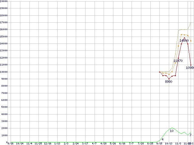 WD10JPVT (1TB,8MB)の価格推移↑前グラフ↓次グラフ(2010年9月16日〜2011年12月1日)※このグラフは過去のデータも税率5%相当に調整した税込み相当額のグラフです。●関連グラフHDD/SSD主要製品の最安値推移HDD/SSD主要製品(最安値1万円〜1万5千円未満)の最安値推移HDD 1TB〜1.5TB未満の最安値推移WD Scorpio Blue (5200〜5400rpm,3Gb/s,2.5インチ)の最安値推移●凡例最安値(点線部は販売店未確認または未調査)平均値最高値ショップ数