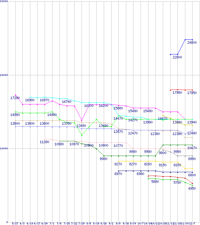 AMD系CPUの最安値推移↑前グラフ↓次グラフ(2011年5月27日〜2011年12月7日)※このグラフは過去のデータも税率5%相当に調整した税込み相当額のグラフです。凡例FX-8150 (3.6GHz,L2 8MB,L3 8MB,TDP 125W)FX-8120 (3.1GHz,L2 8MB,L3 8MB,TDP 125W)Phenom II X6 1065T (2.9GHz,L2 512KB×6,L3 6MB,TDP 95W)Phenom II X6 1090T Black Edition (3.2GHz,L2 512KB×6,L3 6MB,TDP 125W)Phenom II X4 980 Black Edition (3.7GHz,L2 512KB×4,L3 6MB,TDP 125W)FX-6100 (3.3GHz,L2 6MB,L3 8MB,TDP 95W)Phenom II X4 910e (2.6GHz,L2 512KB×4,L3 6MB,TDP 65W)Phenom II X4 970 Black Edition (3.5GHz,L2 512KB×4,L3 6MB,TDP 125W)A6-3650 (2.6GHz,TDP 100W)Phenom II X4 960T Black Edition (3.0GHz,L2 512KB×4,L3 6MB,TDP 95W)FX-4100 (3.6GHz,L2 4MB,L3 8MB,TDP 95W)A6-3500 (2.1GHz,TDP 65W)Athlon II X4 631 (2.6GHz,TDP 100W)A4-3400 (2.7GHz,TDP 65W)A4-3300 (2.5GHz,TDP 65W)※製品名をクリックすると個別のグラフを表示します※点線部は販売店が確認できなかった、または調査データがないことを示します