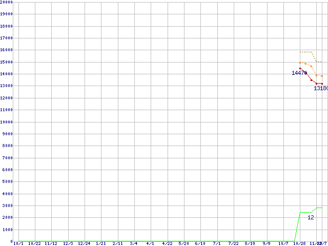 FX-6100 (3.3GHz,L2 6MB,L3 8MB,TDP 95W)の価格推移↑前グラフ↓次グラフ(2010年10月1日〜2011年12月7日)※このグラフは過去のデータも税率5%相当に調整した税込み相当額のグラフです。●関連グラフCPU主要製品の最安値推移CPU主要製品(最安値1万円〜2万円未満)の最安値推移AMD系CPUの最安値推移Socket AM3+ (HyperTransport,6Core)の最安値推移●凡例最安値(点線部は販売店未確認または未調査)平均値最高値ショップ数