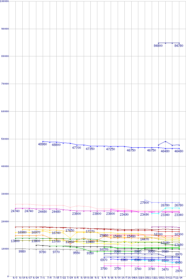 CPU主要製品の最安値推移↑前グラフ↓次グラフ(2011年6月3日〜2011年12月14日)※このグラフは過去のデータも税率5%相当に調整した税込み相当額のグラフです。凡例Core i7-3960X Extreme Edition (3.30GHz,15MB)Core i7-3930K (3.20GHz,12MB)Core i7-980 (3.33GHz)Core i7-2700K (3.50GHz)FX-8150 (3.6GHz,L2 8MB,L3 8MB,TDP 125W)Core i7-2600K (3.40GHz)Core i7-2600S (2.80GHz)Core i7-2600 (3.40GHz)FX-8120 (3.1GHz,L2 8MB,L3 8MB,TDP 125W)Core i5-2500K (3.30GHz,TDP 95W)Core i5-2405S (2.50GHz,TDP 65W)Core i5-2320 (3.00GHz,TDP 95W)Phenom II X6 1065T (2.9GHz,L2 512KB×6,L3 6MB,TDP 95W)Phenom II X4 980 Black Edition (3.7GHz,L2 512KB×4,L3 6MB,TDP 125W)Phenom II X6 1090T Black Edition (3.2GHz,L2 512KB×6,L3 6MB,TDP 125W)A8-3850 (2.9GHz,TDP 100W)FX-6100 (3.3GHz,L2 6MB,L3 8MB,TDP 95W)Phenom II X4 910e (2.6GHz,L2 512KB×4,L3 6MB,TDP 65W)Core i3-2125 (3.30GHz,TDP 65W)Phenom II X4 970 Black Edition (3.5GHz,L2 512KB×4,L3 6MB,TDP 125W)A6-3650 (2.6GHz,TDP 100W)Core i3-2120T (2.60GHz,TDP 35W)Phenom II X4 960T Black Edition (3.0GHz,L2 512KB×4,L3 6MB,TDP 95W)FX-4100 (3.6GHz,L2 4MB,L3 8MB,TDP 95W)Core i3-2100 (3.1GHz,TDP 65W)Pentium G860 (3.0GHz,TDP 65W)A6-3500 (2.1GHz,TDP 65W)Athlon II X4 631 (2.6GHz,TDP 100W)Pentium G630T (2.3GHz,TDP 35W)A4-3400 (2.7GHz,TDP 65W)A4-3300 (2.5GHz,TDP 65W)Celeron G540 (2.5GHz,2MB,TDP 65W)Celeron G530 (2.4GHz,2MB,TDP 65W)Celeron G460 (1.8GHz,1.5MB,TDP 35W)※製品名をクリックすると個別のグラフを表示します※点線部は販売店が確認できなかった、または調査データがないことを示します