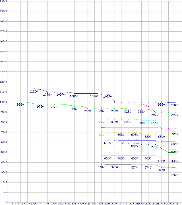 CPU主要製品(最安値1万円未満)の最安値推移↑前グラフ↓次グラフ(2011年6月3日〜2011年12月14日)※このグラフは過去のデータも税率5%相当に調整した税込み相当額のグラフです。凡例Phenom II X4 960T Black Edition (3.0GHz,L2 512KB×4,L3 6MB,TDP 95W)FX-4100 (3.6GHz,L2 4MB,L3 8MB,TDP 95W)Core i3-2100 (3.1GHz,TDP 65W)Pentium G860 (3.0GHz,TDP 65W)A6-3500 (2.1GHz,TDP 65W)Athlon II X4 631 (2.6GHz,TDP 100W)Pentium G630T (2.3GHz,TDP 35W)A4-3400 (2.7GHz,TDP 65W)A4-3300 (2.5GHz,TDP 65W)Celeron G540 (2.5GHz,2MB,TDP 65W)Celeron G530 (2.4GHz,2MB,TDP 65W)Celeron G460 (1.8GHz,1.5MB,TDP 35W)※製品名をクリックすると個別のグラフを表示します※点線部は販売店が確認できなかった、または調査データがないことを示します