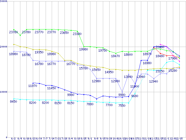 | HDD/SSD主要製品(最安値1万5千円〜2万円未満)の最安値推移 |
