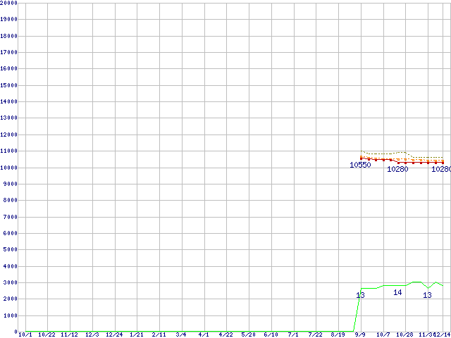 Core i3-2120T (2.60GHz,TDP 35W)の価格推移↑前グラフ↓次グラフ(2010年10月1日〜2011年12月14日)※このグラフは過去のデータも税率5%相当に調整した税込み相当額のグラフです。●関連グラフCPU主要製品の最安値推移CPU主要製品(最安値1万円〜2万円未満)の最安値推移Intel系CPUの最安値推移LGA1155 (Smart Cache 3MB,Dual Core,GPU内蔵,Hyper-Threading)の最安値推移●凡例最安値(点線部は販売店未確認または未調査)平均値最高値ショップ数