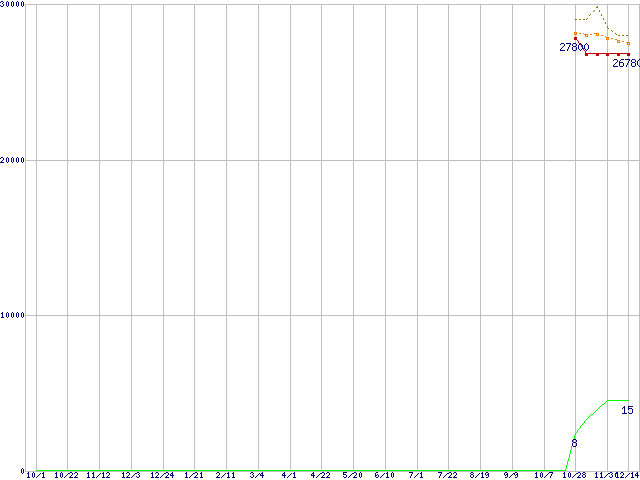 Core i7-2700K (3.50GHz)の価格推移↑前グラフ↓次グラフ(2010年10月1日〜2011年12月14日)※このグラフは過去のデータも税率5%相当に調整した税込み相当額のグラフです。●関連グラフCPU主要製品の最安値推移CPU主要製品(最安値2万円〜3万円未満)の最安値推移Intel系CPUの最安値推移LGA1155 (Smart Cache 8MB,Quad Core,GPU内蔵,Hyper-Threading,TDP 95W)の最安値推移●凡例最安値(点線部は販売店未確認または未調査)平均値最高値ショップ数