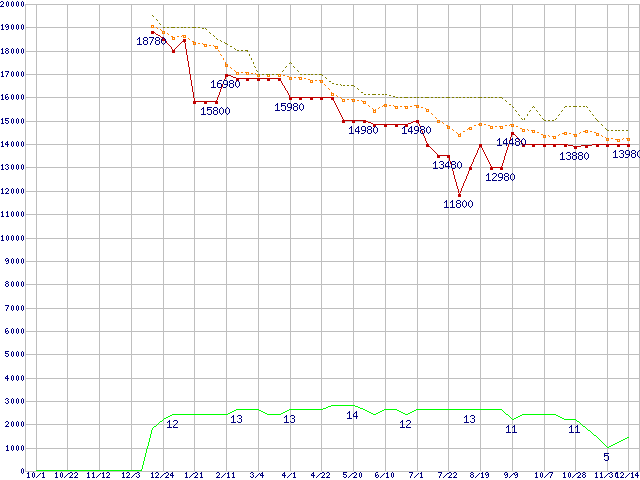 Phenom II X6 1065T (2.9GHz,L2 512KB×6,L3 6MB,TDP 95W)の価格推移↑前グラフ↓次グラフ(2010年10月1日〜2011年12月14日)※このグラフは過去のデータも税率5%相当に調整した税込み相当額のグラフです。●関連グラフCPU主要製品の最安値推移CPU主要製品(最安値1万円〜2万円未満)の最安値推移AMD系CPUの最安値推移Socket AM3 (HyperTransport 3.0,6Core)の最安値推移●凡例最安値(点線部は販売店未確認または未調査)平均値最高値ショップ数