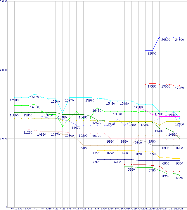 AMD系CPUの最安値推移↑前グラフ↓次グラフ(2011年6月10日〜2011年12月21日)※このグラフは過去のデータも税率5%相当に調整した税込み相当額のグラフです。凡例FX-8150 (3.6GHz,L2 8MB,L3 8MB,TDP 125W)FX-8120 (3.1GHz,L2 8MB,L3 8MB,TDP 125W)Phenom II X6 1065T (2.9GHz,L2 512KB×6,L3 6MB,TDP 95W)FX-6100 (3.3GHz,L2 6MB,L3 8MB,TDP 95W)Phenom II X6 1090T Black Edition (3.2GHz,L2 512KB×6,L3 6MB,TDP 125W)Phenom II X4 910e (2.6GHz,L2 512KB×4,L3 6MB,TDP 65W)A8-3850 (2.9GHz,TDP 100W)A6-3650 (2.6GHz,TDP 100W)Phenom II X4 970 Black Edition (3.5GHz,L2 512KB×4,L3 6MB,TDP 125W)Phenom II X4 960T Black Edition (3.0GHz,L2 512KB×4,L3 6MB,TDP 95W)FX-4100 (3.6GHz,L2 4MB,L3 8MB,TDP 95W)A6-3500 (2.1GHz,TDP 65W)Athlon II X4 631 (2.6GHz,TDP 100W)A4-3400 (2.7GHz,TDP 65W)A4-3300 (2.5GHz,TDP 65W)※製品名をクリックすると個別のグラフを表示します※点線部は販売店が確認できなかった、または調査データがないことを示します
