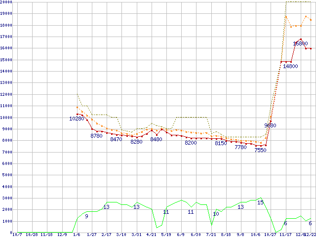 0S03191(純正パッケージ品) (2TB,64MB)の価格推移↑前グラフ↓次グラフ(2010年10月7日〜2011年12月22日)※このグラフは過去のデータも税率5%相当に調整した税込み相当額のグラフです。●関連グラフHDD/SSD主要製品の最安値推移HDD/SSD主要製品(最安値1万5千円〜2万円未満)の最安値推移HDD 2TB〜2.5TB未満の最安値推移DESKSTAR (6Gb/s)の最安値推移●凡例最安値(点線部は販売店未確認または未調査)平均値最高値ショップ数
