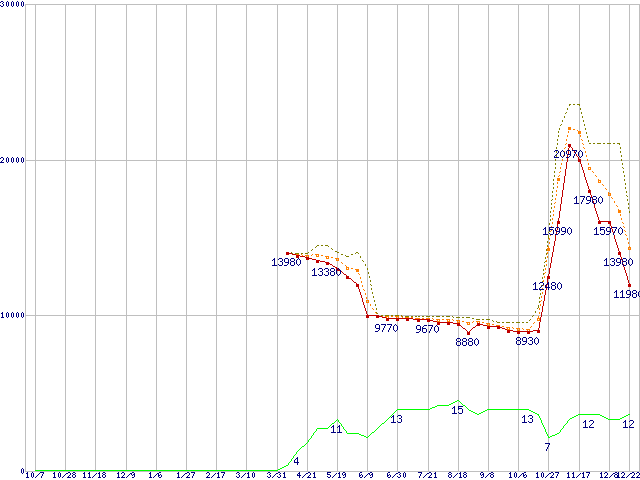 WD30EZRX (3TB,64MB)の価格推移↑前グラフ↓次グラフ(2010年10月7日〜2011年12月22日)※このグラフは過去のデータも税率5%相当に調整した税込み相当額のグラフです。●関連グラフHDD/SSD主要製品の最安値推移HDD/SSD主要製品(最安値1万円〜1万5千円未満)の最安値推移HDD 3TB〜4TB未満の最安値推移WD Caviar Green (6Gb/s)の最安値推移●凡例最安値(点線部は販売店未確認または未調査)平均値最高値ショップ数