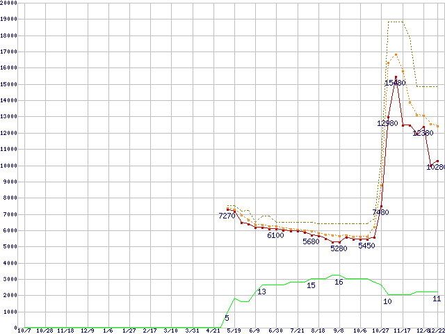 WD20EARX (2TB,64MB)の価格推移↑前グラフ↓次グラフ(2010年10月7日〜2011年12月22日)※このグラフは過去のデータも税率5%相当に調整した税込み相当額のグラフです。●関連グラフHDD/SSD主要製品の最安値推移HDD/SSD主要製品(最安値1万円〜1万5千円未満)の最安値推移HDD 2TB〜2.5TB未満の最安値推移WD Caviar Green (6Gb/s)の最安値推移●凡例最安値(点線部は販売店未確認または未調査)平均値最高値ショップ数