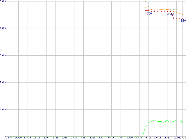 Celeron G540 (2.5GHz,2MB,TDP 65W)の価格推移↑前グラフ↓次グラフ(2010年10月8日〜2011年12月21日)※このグラフは過去のデータも税率5%相当に調整した税込み相当額のグラフです。●関連グラフCPU主要製品の最安値推移CPU主要製品(最安値1万円未満)の最安値推移Intel系CPUの最安値推移LGA1155 (GPU内蔵)の最安値推移●凡例最安値(点線部は販売店未確認または未調査)平均値最高値ショップ数