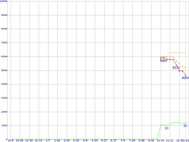 A4-3300 (2.5GHz,TDP 65W)の価格推移↑前グラフ↓次グラフ(2010年10月8日〜2011年12月21日)※このグラフは過去のデータも税率5%相当に調整した税込み相当額のグラフです。●関連グラフCPU主要製品の最安値推移CPU主要製品(最安値1万円未満)の最安値推移AMD系CPUの最安値推移Socket FM1 (Cache 1MB,2Core,Radeon HD 6410D)の最安値推移●凡例最安値(点線部は販売店未確認または未調査)平均値最高値ショップ数