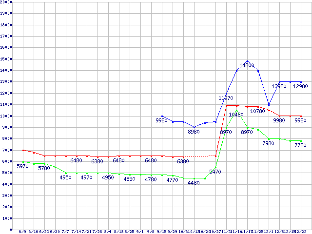 | WD Scorpio Blue (5200〜5400rpm,3Gb/s,2.5インチ)の最安値推移 |
