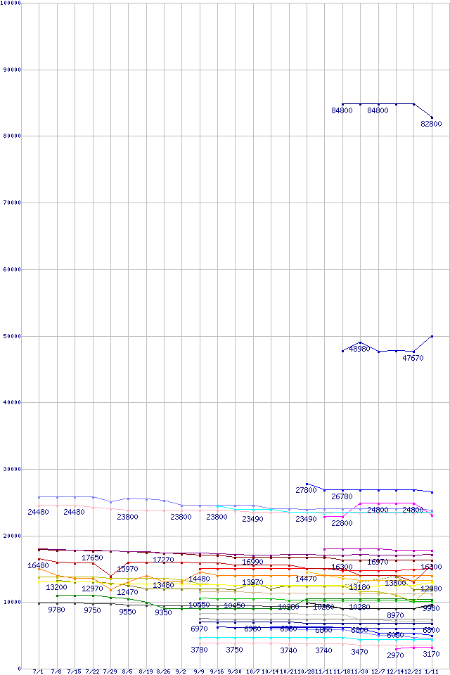 CPU主要製品の最安値推移↑前グラフ↓次グラフ(2011年7月1日〜2012年1月11日)※このグラフは過去のデータも税率5%相当に調整した税込み相当額のグラフです。凡例Core i7-3960X Extreme Edition (3.30GHz,15MB)Core i7-3930K (3.20GHz,12MB)Core i7-2700K (3.50GHz)Core i7-2600K (3.40GHz)Core i7-2600S (2.80GHz)Core i7-2600 (3.40GHz)FX-8150 (3.6GHz,L2 8MB,L3 8MB,TDP 125W)FX-8120 (3.1GHz,L2 8MB,L3 8MB,TDP 125W)Core i5-2500K (3.30GHz,TDP 95W)Core i5-2405S (2.50GHz,TDP 65W)Phenom II X6 1090T Black Edition (3.2GHz,L2 512KB×6,L3 6MB,TDP 125W)Core i5-2320 (3.00GHz,TDP 95W)Phenom II X6 1065T (2.9GHz,L2 512KB×6,L3 6MB,TDP 95W)FX-6100 (3.3GHz,L2 6MB,L3 8MB,TDP 95W)A8-3870K (3.0GHz,TDP 100W)Phenom II X4 910e (2.6GHz,L2 512KB×4,L3 6MB,TDP 65W)Phenom II X4 970 Black Edition (3.5GHz,L2 512KB×4,L3 6MB,TDP 125W)A8-3850 (2.9GHz,TDP 100W)Core i3-2125 (3.30GHz,TDP 65W)A6-3650 (2.6GHz,TDP 100W)Core i3-2120T (2.60GHz,TDP 35W)A6-3670K (2.7GHz,TDP 100W)FX-4100 (3.6GHz,L2 4MB,L3 8MB,TDP 95W)Core i3-2100 (3.1GHz,TDP 65W)Pentium G860 (3.0GHz,TDP 65W)A6-3500 (2.1GHz,TDP 65W)Athlon II X4 631 (2.6GHz,TDP 100W)Pentium G630T (2.3GHz,TDP 35W)A4-3400 (2.7GHz,TDP 65W)A4-3300 (2.5GHz,TDP 65W)Celeron G540 (2.5GHz,2MB,TDP 65W)Celeron G530 (2.4GHz,2MB,TDP 65W)Celeron G460 (1.8GHz,1.5MB,TDP 35W)※製品名をクリックすると個別のグラフを表示します※点線部は販売店が確認できなかった、または調査データがないことを示します