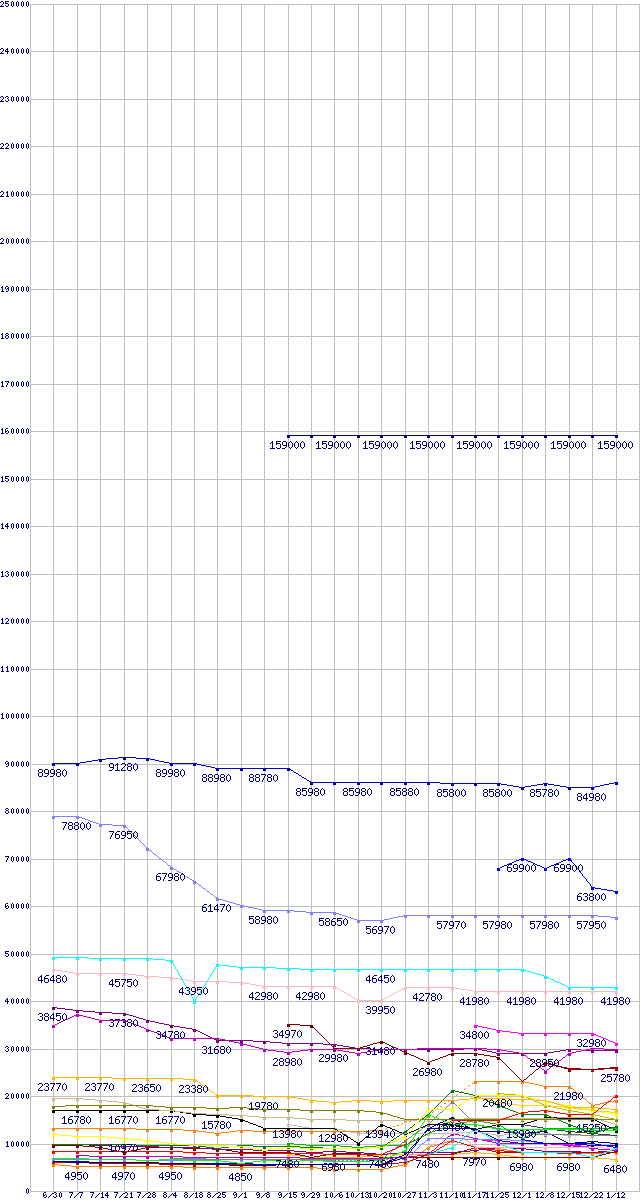 HDD/SSD主要製品の最安値推移↑前グラフ↓次グラフ(2011年6月30日〜2012年1月12日)※このグラフは過去のデータも税率5%相当に調整した税込み相当額のグラフです。凡例その他SandForce製コントローラ搭載SSD(6Gbps) (480GB,MLC)SSD 320 (600GB,MLC)MZ-7PC512 (512GB,MLC)CT512M4SSD2 (512GB,MLC)SSDSC2MH250A2K5 (250GB,MLC)SSD 320 (300GB,MLC)MZ-7PC256 (256GB,MLC)その他6Gbps対応SSD (256GB,MLC)CT256M4SSD2 (256GB,MLC)その他SandForce製コントローラ搭載SSD(6Gbps) (240GB,MLC)0S03361(純正パッケージ品) (4TB,32MB)0S03191(純正パッケージ品) (2TB,64MB)0S03088(純正パッケージ品) (3TB,64MB)SSDSC2MH120A2K5 (120GB,MLC)MZ-7PC128 (128GB,MLC)0S03229(純正パッケージ品) (3TB,32MB)ST3000DM001 (3TB,64MB)SSD 320 (120GB,MLC)CT128M4SSD2 (128GB,MLC)WD30EZRX (3TB,64MB)WD10JPVT (1TB,8MB)0S03224(純正パッケージ品) (2TB,32MB)その他6Gbps対応SSD (128GB,MLC)ST2000DM001 (2TB,64MB)WD25EZRX (2.5TB,64MB)その他SandForce製コントローラ搭載SSD(6Gbps) (120GB,MLC)WD20EARX (2TB,64MB)ST2000DL003 (2TB,64MB)ST1000DM003 (1TB,64MB)WD10TPVT (1TB,8MB,12.5mm厚)日立製その他3.5インチHDD 1TBWesternDigital製その他3.5インチHDD 1TBMZ-7PC064 (64GB,MLC)HN-M101MBB (1TB,8MB)CT064M4SSD2 (64GB,MLC)その他6Gbps対応SSD (64GB,MLC)0S03085 (750GB,8MB)ST9750423AS (750GB,16MB)WD7500BPVT (750GB,8MB)その他SandForce製コントローラ搭載SSD(6Gbps) (60GB,MLC)※製品名をクリックすると個別のグラフを表示します※点線部は販売店が確認できなかった、または調査データがないことを示します