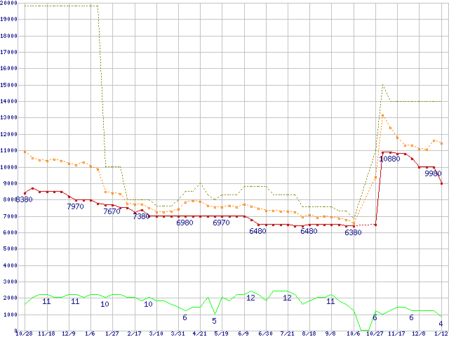WD10TPVT (1TB,8MB,12.5mm厚)の価格推移↑前グラフ↓次グラフ(2010年10月28日〜2012年1月12日)※このグラフは過去のデータも税率5%相当に調整した税込み相当額のグラフです。●関連グラフHDD/SSD主要製品の最安値推移HDD/SSD主要製品(最安値1万円未満)の最安値推移HDD 1TB〜1.5TB未満の最安値推移WD Scorpio Blue (5200〜5400rpm,3Gb/s,2.5インチ)の最安値推移●凡例最安値(点線部は販売店未確認または未調査)平均値最高値ショップ数