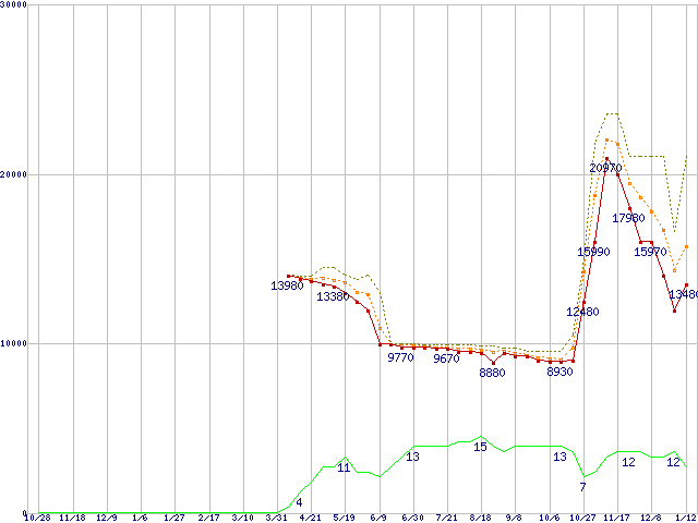 WD30EZRX (3TB,64MB)の価格推移↑前グラフ↓次グラフ(2010年10月28日〜2012年1月12日)※このグラフは過去のデータも税率5%相当に調整した税込み相当額のグラフです。●関連グラフHDD/SSD主要製品の最安値推移HDD/SSD主要製品(最安値1万円〜1万5千円未満)の最安値推移HDD 3TB〜4TB未満の最安値推移WD Caviar Green (6Gb/s)の最安値推移●凡例最安値(点線部は販売店未確認または未調査)平均値最高値ショップ数