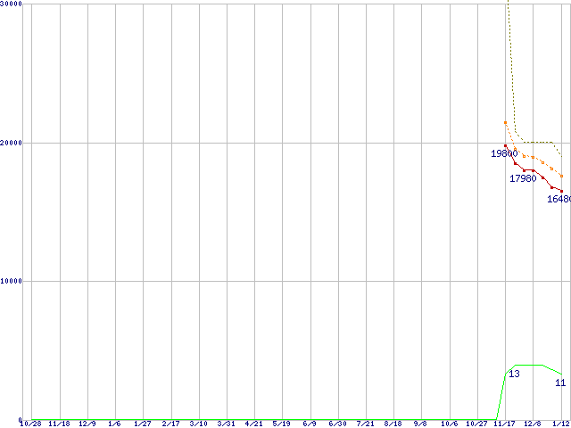 MZ-7PC128 (128GB,MLC)の価格推移↑前グラフ↓次グラフ(2010年10月28日〜2012年1月12日)※このグラフは過去のデータも税率5%相当に調整した税込み相当額のグラフです。●関連グラフHDD/SSD主要製品の最安値推移HDD/SSD主要製品(最安値1万5千円〜2万円未満)の最安値推移HDD 100〜160GB未満の最安値推移SSD 830 (SSD,6Gb/s,2.5インチ,リード520MB/s・ライト400〜160MB/s)の最安値推移●凡例最安値(点線部は販売店未確認または未調査)平均値最高値ショップ数