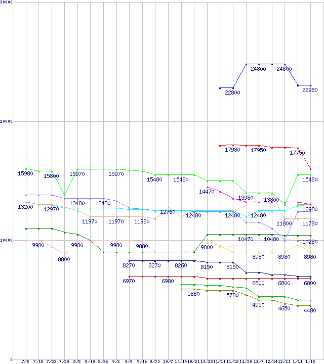 AMD系CPUの最安値推移↑前グラフ↓次グラフ(2011年7月8日〜2012年1月18日)※このグラフは過去のデータも税率5%相当に調整した税込み相当額のグラフです。凡例FX-8150 (3.6GHz,L2 8MB,L3 8MB,TDP 125W)FX-8120 (3.1GHz,L2 8MB,L3 8MB,TDP 125W)Phenom II X6 1090T Black Edition (3.2GHz,L2 512KB×6,L3 6MB,TDP 125W)FX-6100 (3.3GHz,L2 6MB,L3 8MB,TDP 95W)Phenom II X4 910e (2.6GHz,L2 512KB×4,L3 6MB,TDP 65W)A8-3870K (3.0GHz,TDP 100W)Phenom II X4 970 Black Edition (3.5GHz,L2 512KB×4,L3 6MB,TDP 125W)A8-3850 (2.9GHz,TDP 100W)A6-3650 (2.6GHz,TDP 100W)Phenom II X4 955 (3.2GHz,L2 512KB×4,L3 6MB,TDP 95W)A6-3670K (2.7GHz,TDP 100W)FX-4100 (3.6GHz,L2 4MB,L3 8MB,TDP 95W)A6-3500 (2.1GHz,TDP 65W)Athlon II X4 631 (2.6GHz,TDP 100W)A4-3400 (2.7GHz,TDP 65W)A4-3300 (2.5GHz,TDP 65W)※製品名をクリックすると個別のグラフを表示します※点線部は販売店が確認できなかった、または調査データがないことを示します