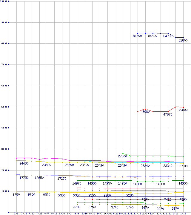 Intel系CPUの最安値推移↑前グラフ↓次グラフ(2011年7月8日〜2012年1月18日)※このグラフは過去のデータも税率5%相当に調整した税込み相当額のグラフです。凡例Core i7-3960X Extreme Edition (3.30GHz,15MB)Core i7-3930K (3.20GHz,12MB)Core i7-2700K (3.50GHz)Core i7-2600K (3.40GHz)Core i7-2600S (2.80GHz)Core i7-2600 (3.40GHz)Core i5-2500K (3.30GHz,TDP 95W)Core i5-2405S (2.50GHz,TDP 65W)Core i5-2320 (3.00GHz,TDP 95W)Core i3-2125 (3.30GHz,TDP 65W)Core i3-2120T (2.60GHz,TDP 35W)Core i3-2100 (3.1GHz,TDP 65W)Pentium G860 (3.0GHz,TDP 65W)Pentium G630T (2.3GHz,TDP 35W)Celeron G540 (2.5GHz,2MB,TDP 65W)Celeron G530 (2.4GHz,2MB,TDP 65W)Celeron G460 (1.8GHz,1.5MB,TDP 35W)※製品名をクリックすると個別のグラフを表示します※点線部は販売店が確認できなかった、または調査データがないことを示します