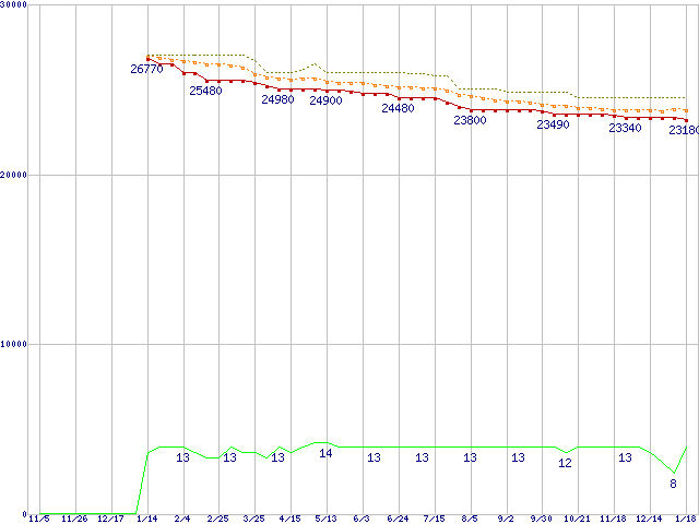 Core i7-2600 (3.40GHz)の価格推移↑前グラフ↓次グラフ(2010年11月5日〜2012年1月18日)※このグラフは過去のデータも税率5%相当に調整した税込み相当額のグラフです。●関連グラフCPU主要製品の最安値推移CPU主要製品(最安値2万円〜3万円未満)の最安値推移Intel系CPUの最安値推移LGA1155 (Smart Cache 8MB,Quad Core,GPU内蔵,Hyper-Threading,TDP 95W)の最安値推移●凡例最安値(点線部は販売店未確認または未調査)平均値最高値ショップ数