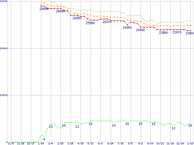 Core i7-2600K (3.40GHz)の価格推移↑前グラフ↓次グラフ(2010年11月5日〜2012年1月18日)※このグラフは過去のデータも税率5%相当に調整した税込み相当額のグラフです。●関連グラフCPU主要製品の最安値推移CPU主要製品(最安値2万円〜3万円未満)の最安値推移Intel系CPUの最安値推移LGA1155 (Smart Cache 8MB,Quad Core,GPU内蔵,Hyper-Threading,TDP 95W)の最安値推移●凡例最安値(点線部は販売店未確認または未調査)平均値最高値ショップ数
