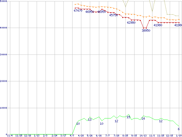 SSD 320 (300GB,MLC)の価格推移↑前グラフ↓次グラフ(2010年11月4日〜2012年1月19日)※このグラフは過去のデータも税率5%相当に調整した税込み相当額のグラフです。●関連グラフHDD/SSD主要製品の最安値推移HDD/SSD主要製品(最安値2万円以上)の最安値推移HDD 300〜400GB未満の最安値推移SSD 320 (SSD,3Gbps,2.5インチ,リード270〜200MB/s・ライト220〜45MB/s)の最安値推移●凡例最安値(点線部は販売店未確認または未調査)平均値最高値ショップ数