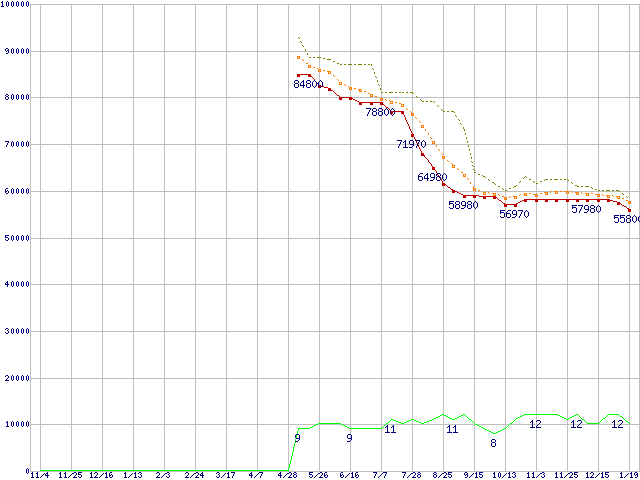 CT512M4SSD2 (512GB,MLC)の価格推移↑前グラフ↓次グラフ(2010年11月4日〜2012年1月19日)※このグラフは過去のデータも税率5%相当に調整した税込み相当額のグラフです。●関連グラフHDD/SSD主要製品の最安値推移HDD/SSD主要製品(最安値2万円以上)の最安値推移HDD 500〜600GB未満の最安値推移m4 (SSD,6Gbps,2.5インチ,リード415MB/s・ライト260〜95MB/s)の最安値推移●凡例最安値(点線部は販売店未確認または未調査)平均値最高値ショップ数
