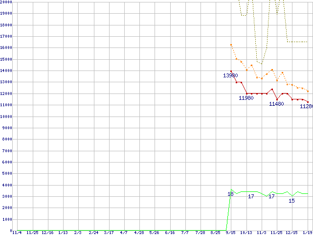 その他SandForce製コントローラ搭載SSD(6Gbps) (120GB,MLC)の価格推移↑前グラフ↓次グラフ(2010年11月4日〜2012年1月19日)※このグラフは過去のデータも税率5%相当に調整した税込み相当額のグラフです。●関連グラフHDD/SSD主要製品の最安値推移HDD/SSD主要製品(最安値1万円〜1万5千円未満)の最安値推移HDD 100〜160GB未満の最安値推移2.5インチSSD (SSD,6Gbps,2.5インチ,SandForce SF-2200)の最安値推移●凡例最安値(点線部は販売店未確認または未調査)平均値最高値ショップ数