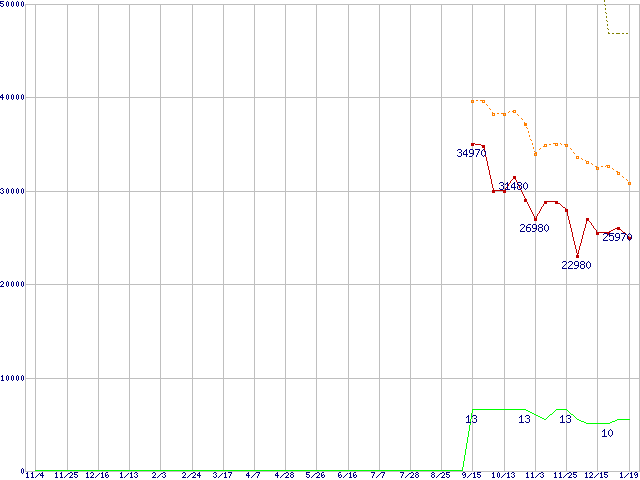 その他SandForce製コントローラ搭載SSD(6Gbps) (240GB,MLC)の価格推移↑前グラフ↓次グラフ(2010年11月4日〜2012年1月19日)※このグラフは過去のデータも税率5%相当に調整した税込み相当額のグラフです。●関連グラフHDD/SSD主要製品の最安値推移HDD/SSD主要製品(最安値2万円以上)の最安値推移HDD 200〜250GB未満の最安値推移2.5インチSSD (SSD,6Gbps,2.5インチ,SandForce SF-2200)の最安値推移●凡例最安値(点線部は販売店未確認または未調査)平均値最高値ショップ数