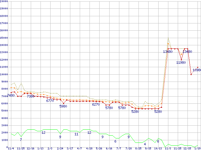 HD204UI (2TB,32MB)の価格推移↑前グラフ↓次グラフ(2010年11月4日〜2012年1月19日)※このグラフは過去のデータも税率5%相当に調整した税込み相当額のグラフです。●関連グラフHDD/SSD主要製品の最安値推移HDD/SSD主要製品(最安値1万円〜1万5千円未満)の最安値推移HDD 2TB〜2.5TB未満の最安値推移EcoGreent F4 (5400rpm,3Gb/s,3.5インチ)の最安値推移●凡例最安値(点線部は販売店未確認または未調査)平均値最高値ショップ数