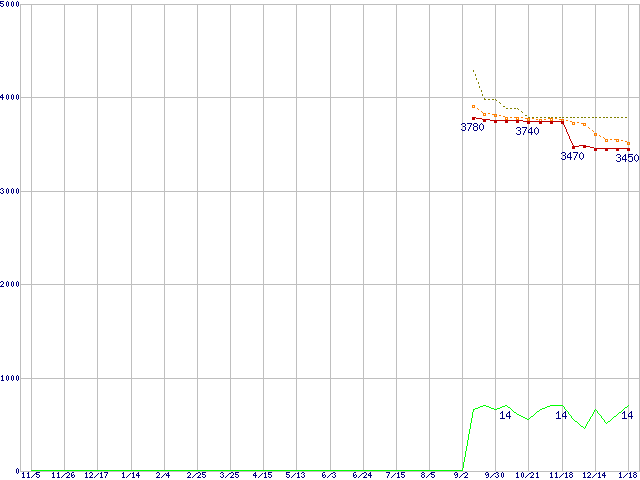 Celeron G530 (2.4GHz,2MB,TDP 65W)の価格推移↑前グラフ↓次グラフ(2010年11月5日〜2012年1月18日)※このグラフは過去のデータも税率5%相当に調整した税込み相当額のグラフです。●関連グラフCPU主要製品の最安値推移CPU主要製品(最安値1万円未満)の最安値推移Intel系CPUの最安値推移LGA1155 (GPU内蔵)の最安値推移●凡例最安値(点線部は販売店未確認または未調査)平均値最高値ショップ数