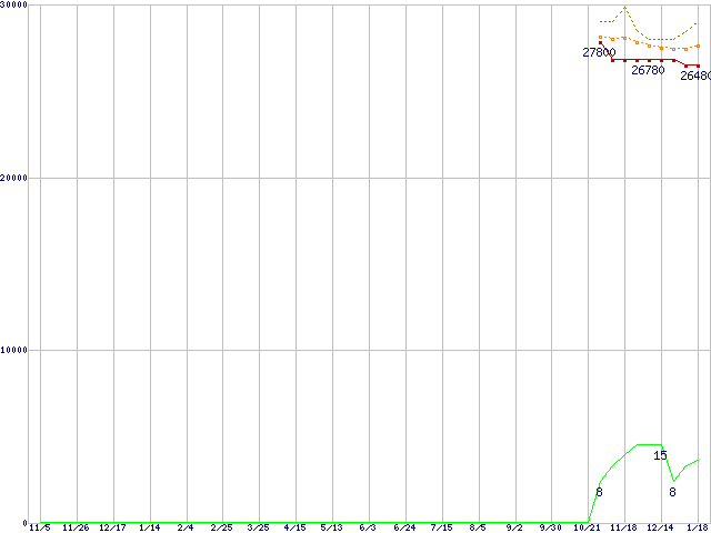 Core i7-2700K (3.50GHz)の価格推移↑前グラフ↓次グラフ(2010年11月5日〜2012年1月18日)※このグラフは過去のデータも税率5%相当に調整した税込み相当額のグラフです。●関連グラフCPU主要製品の最安値推移CPU主要製品(最安値2万円〜3万円未満)の最安値推移Intel系CPUの最安値推移LGA1155 (Smart Cache 8MB,Quad Core,GPU内蔵,Hyper-Threading,TDP 95W)の最安値推移●凡例最安値(点線部は販売店未確認または未調査)平均値最高値ショップ数