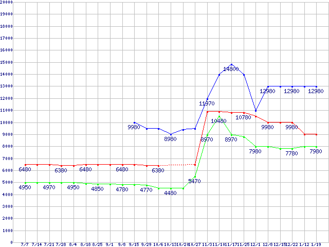 | WD Scorpio Blue (5200〜5400rpm,3Gb/s,2.5インチ)の最安値推移 |